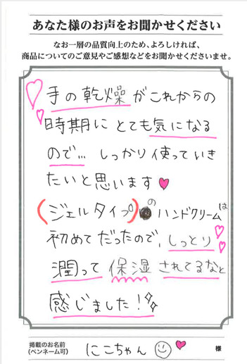 他にも水分たっぷりのジェルに3種のセラミドと3種のコラーゲンが入っており、手に潤いを与えます。さらにオーガニックオイルとしてシアバター・ホホバオイル・マカデミアナッツオイルを配合。
