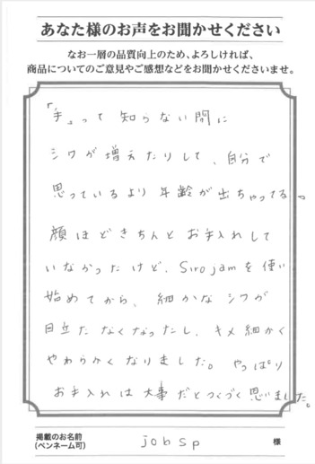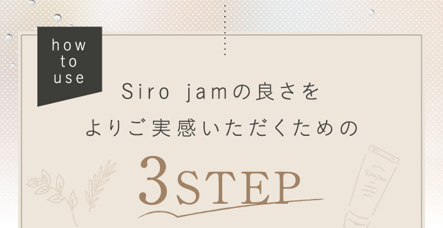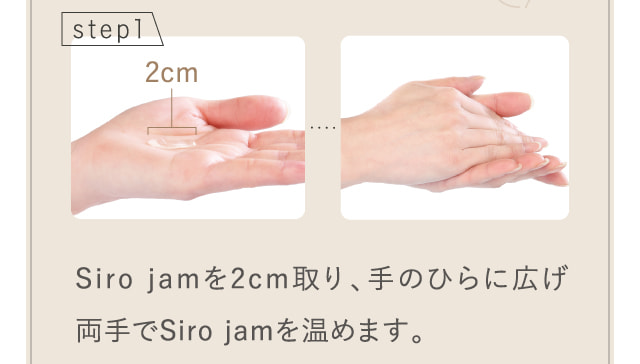 夜、寝る前に約1g(さくらんぼ大)を手に取り、なじませてください。手のひらに広げた後、両手でSiro jam温めてご使用いただくと肌になじみやすくなります。